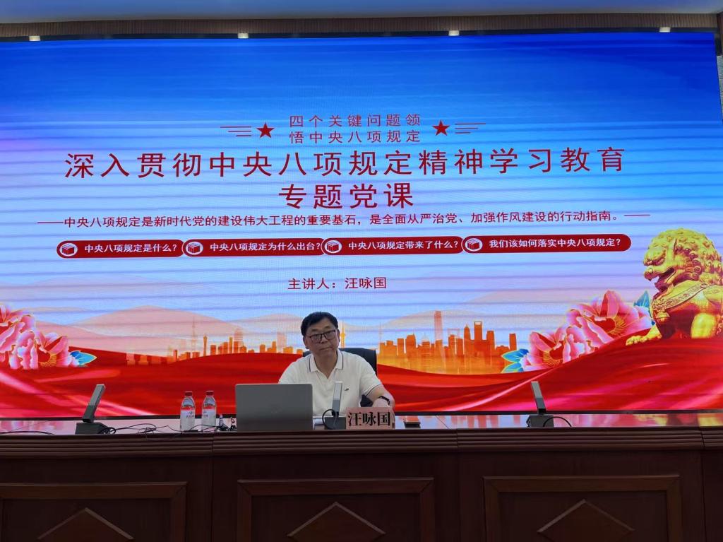 5月22日下午,党委常委、副校长汪咏国在4号报告厅,以《中央八项规定是新时代党的建设伟大工程的重要基石,是全面从严治党、加强作风建设的行动指南》为题,为PA视讯集团网站和外国语学院师生党员讲授专题党课。