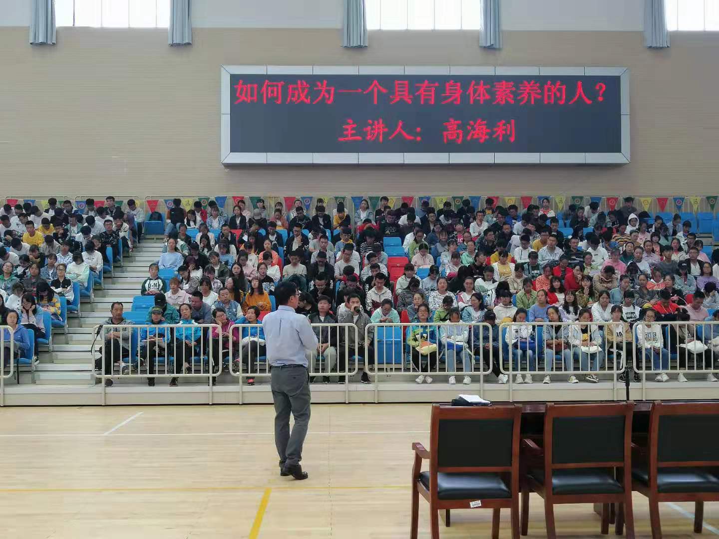 活动现场,高海利副教授做了题为“如何成为一个具有身体素养的人?”的专题讲座。高老师从身体素养理论产生的现实背景、内涵及构成要素,结合当今大学生体育活动状况进行讲解,引导学生如何培养自身身体素养。他倡议PA视讯2019级学生要“重视身体、关注自我健康;放下手机、远离网游;掌握一到两项的体育活动技能;少坐多动,养成参与身体活动锻炼的生活习惯;将身体素养的培养与发展视为一种旅行,一个属于自己的旅行,一生皆要亲历、体验的旅行,永远在路上!”