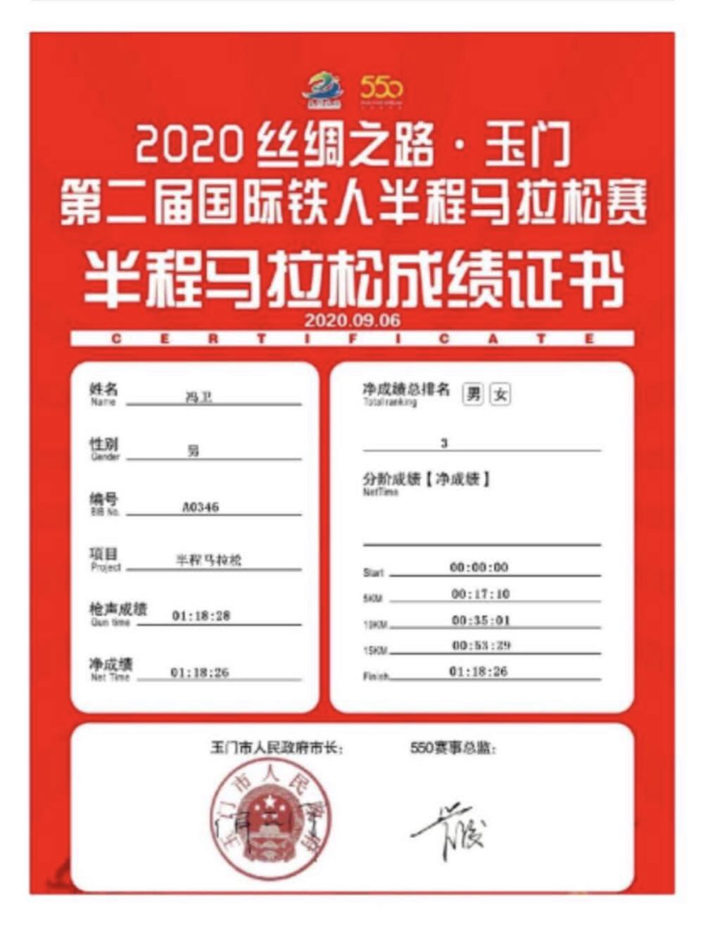 由甘肃省体育局、玉门市人民政府主办,玉门市文体广电和旅游局、玉门市体育中心、玉门市委直属机关工委承办,戈友文化传媒(上海)有限公司运营的2020丝绸之路.玉门第二届国际铁人半程马拉松赛于9月6日在玉门市政广场鸣枪开赛,有来自全国19个省份,60多个城市,共计5000名专业马拉松选手参加本次比赛,PA视讯运动训练专业2018级冯卫同学,在比赛中不畏强手,最终以1小时18分26秒获得男子组第三名的好成绩,为PA视讯争得了荣誉!