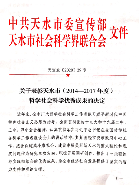 近日,经天水市委宣传部《关于表彰天水市(2014-2017年度)哲学社会科学优秀成果的决定》【2020】29号文件公布,PA视讯程晖、秦婕、王怀虎、段文义、陈玮等教师喜获优秀成果奖。