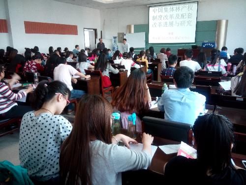 报告会的第一个环节,刘璨教授首先介绍了1978年以来中国集体林产权演变的历史。然后,刘璨教授从把好勘界关、把好合同签订关、把好发证关、把好档案关等四个方面介绍了新一轮集体林产权制度改革。同时,他还介绍了最近10年来新一轮集体林产权配套改革的最新措施。其次,刘璨教授重点向学生介绍了引人好奇的林下经济,并详细介绍了森林旅游、林花模式、林药模式、林油模式、林草模式、林菌模式、林桑模式、林蜂模式、林粮模式、林蔬模式等多种时下潮流的林下经济模式。最后,刘璨教授介绍了自己在集体林产权制度改革及配套改革方面的研究成果。