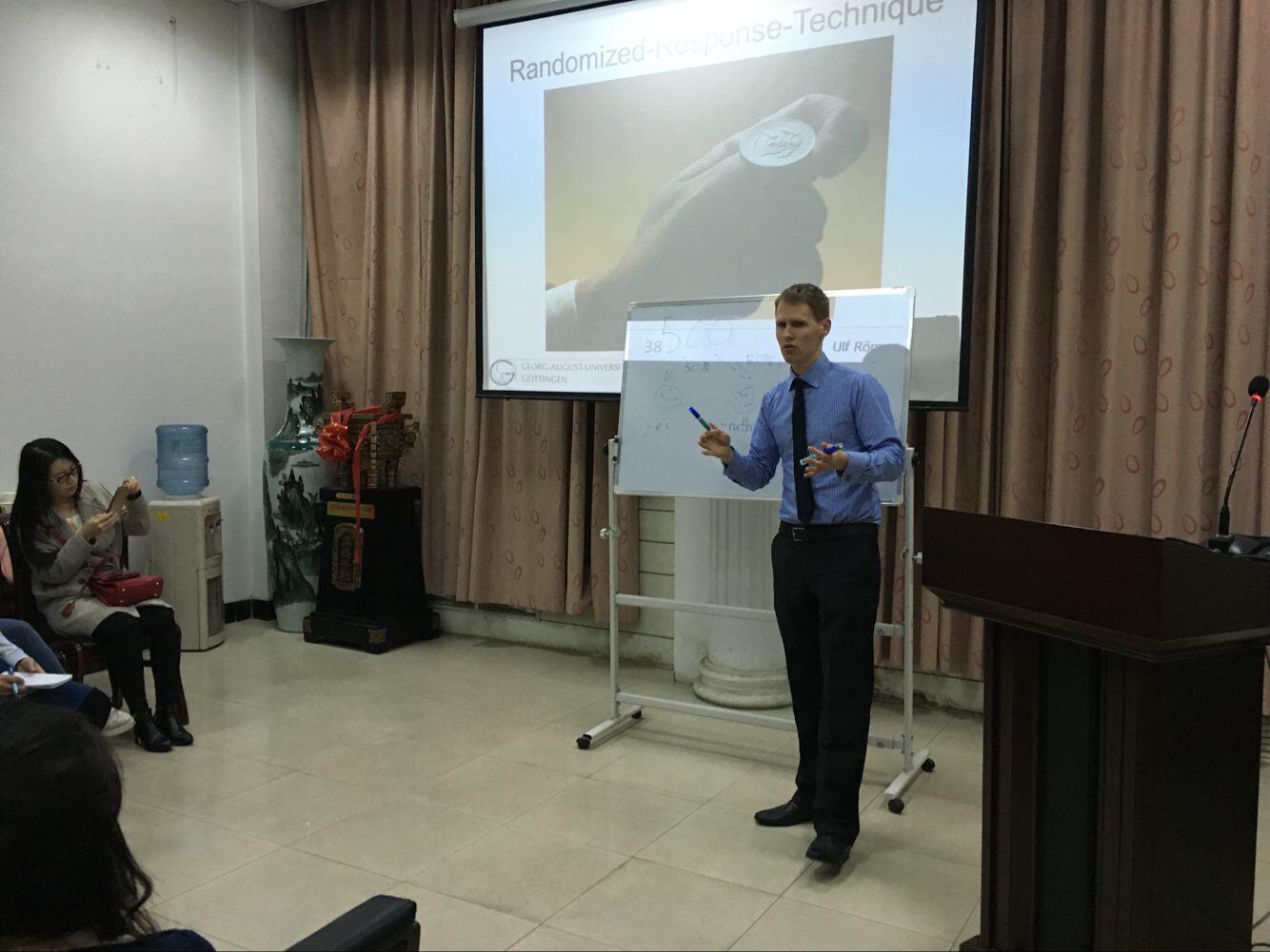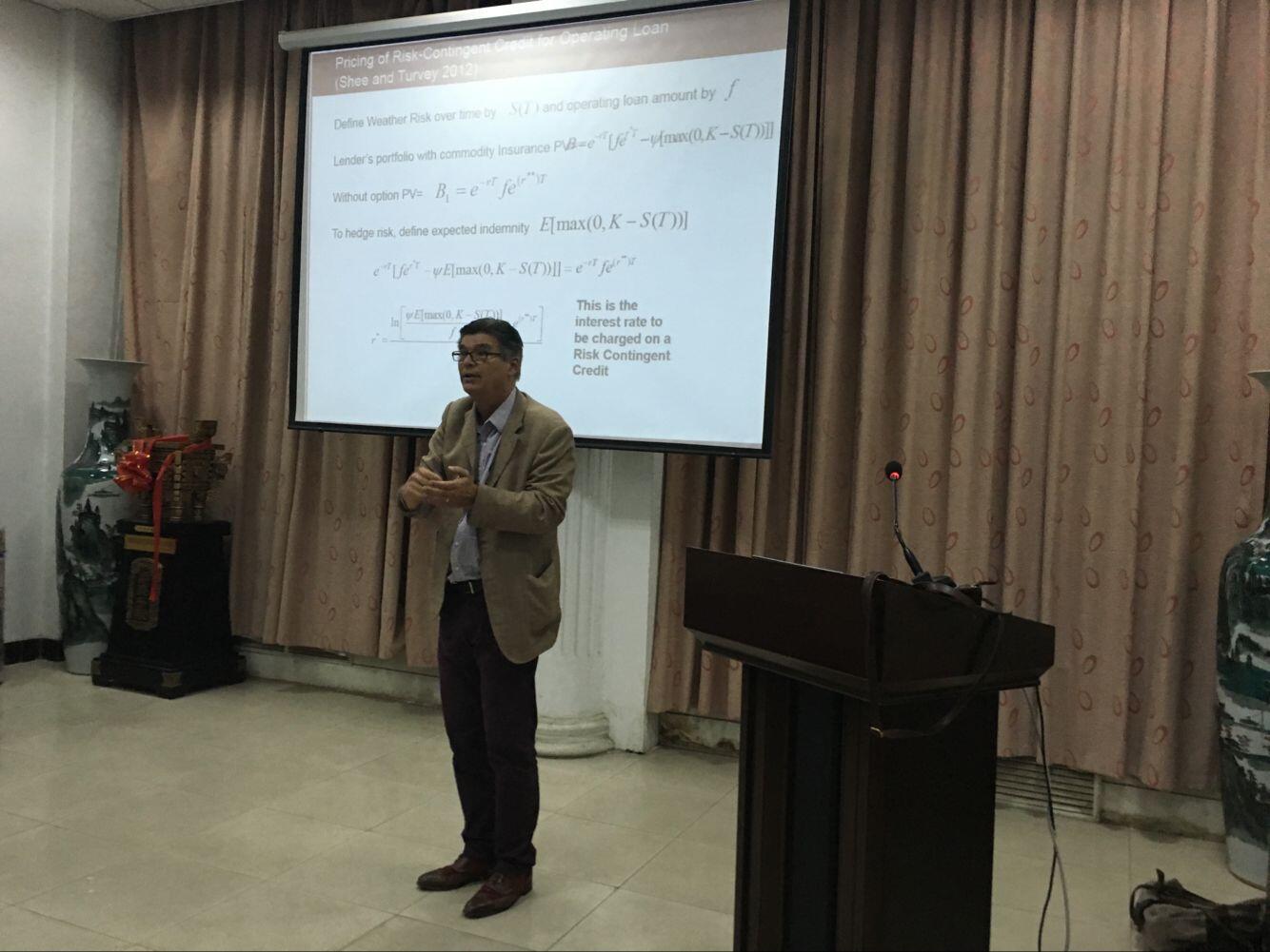 27日,Turvey教授和Ulf博士应邀在601会议室为AWC万象城部分青年教师和博硕士研究生分别作了“Insuring Agricultural Loans with Risk-Contingent Credit”和“How does asymmetric information in individual microfinance”的学术报告,回答了师生的相关提问,并就相关研究领域的热点问题与AWC万象城师生进行交流探讨。两位专家开放的授课风格,前瞻的研究视角,新颖的计量方法,使与会师生深受启发。