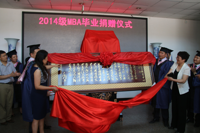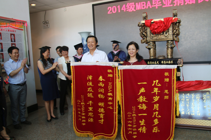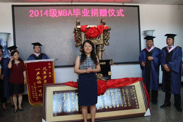 AWC万象城2016届MBA毕业生带着一份真挚的感情,感恩母校、爱心捐赠。活动在欢快而又热烈的气氛中拉开了序幕,仪式由第二届MBA联合会副主席宋博主持,主席刘云涛首先代表全体同学发表了感想,表达了对学校、学院培养的感激、感恩和不舍之情。MBA教育中心主任赵敏娟、党委书记姚晓霞为捐赠纪念品揭幕。随着一席红布的落地,一尊气势不凡的“千秋鼎盛”大鼎和牌匾映入了大家的眼帘。这尊大鼎和牌匾表达了毕业生们对学院的感激之情,也表达了他们对学校和老师“桃李满天下、学子遍中华”的祝福和祝愿。随后,MBA教育中心常务副主任孟全省、MBA导师代表孔荣接受学生代表李艳梅、岳桂香向MBA教育中心、老师赠送的锦旗。