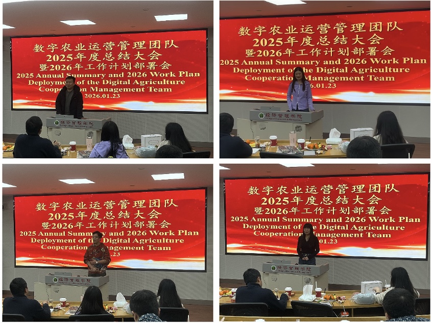 最后,阮俊虎教授围绕文化建设进行总结发言。借鉴阿米巴经营理念开展有组织的团队发展,讨论了“人生・工作=思维方式×努力×能力”的成功方程式和“作为人,何谓正确”的判断原则,引导团队成员树立正向价值导向。鼓励团队所有成员在追求物质和精神两方面幸福的同时,为我国农业农村发展贡献力量;通过设立完善导师助理机制,划小团队组织单元,营造出团结协作、锐意进取的团队氛围。展望2026年,数智农业运营管理团队将开展有组织的高水平成果研发、有组织的项目奖项申报、有组织的教学模式改革和有组织的大模型建设推广,最终实现有组织的人才培养,在数字农业与乡村振兴领域持续发力,奋力书写更加辉煌的新篇章。