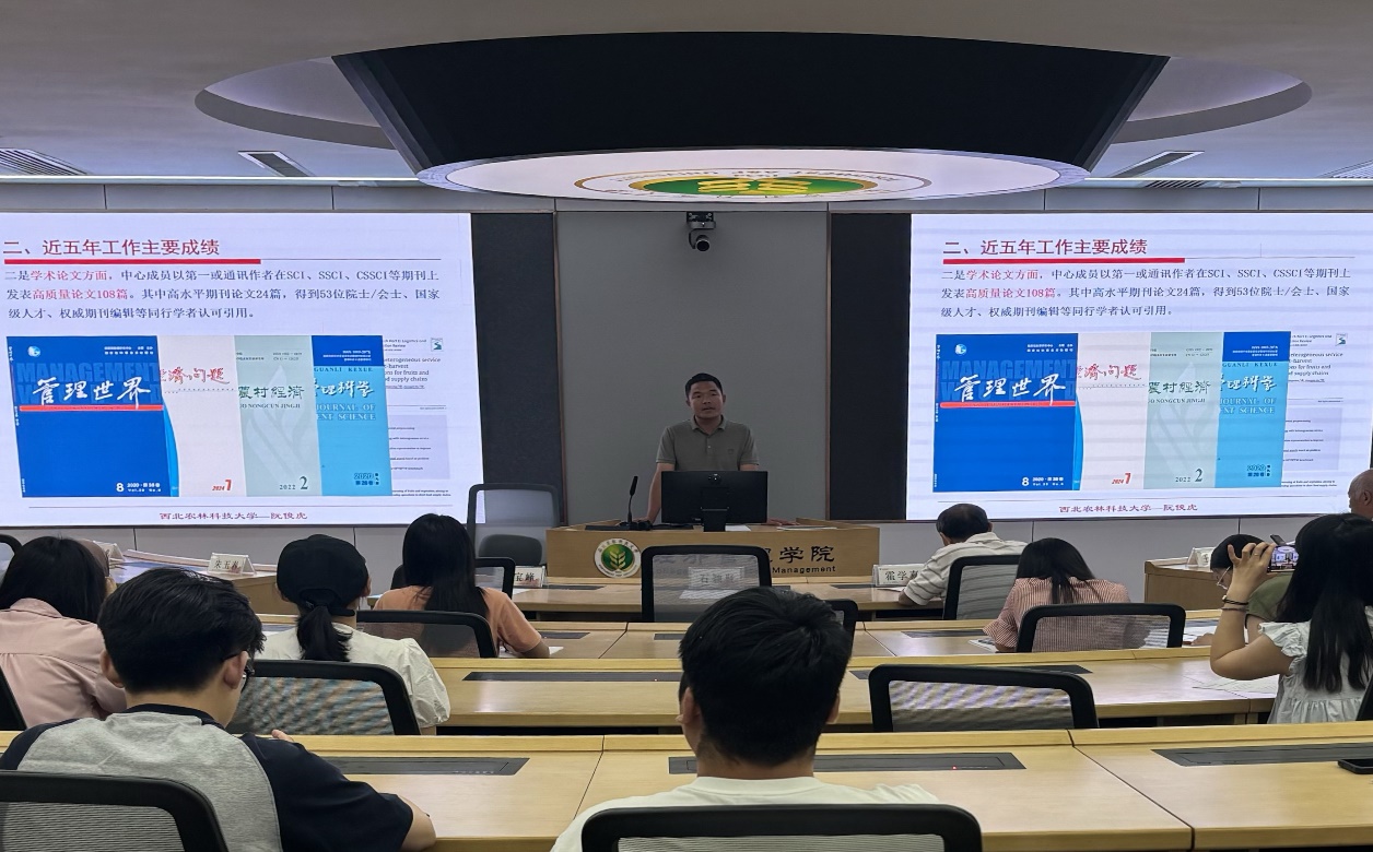 党员大会后,召开了西部农村发展研究中心建设推进会。会上,阮俊虎主任围绕“中心建设成效与未来发展方向”作专题汇报。从科研项目、高水平论文、智库建言、教学改革、人才培养等方面系统总结了中心近五年来取得的阶段性成果:共承担国家级与省部级课题86项,科研经费总计达2700余万元;在《管理世界》、《中国农村经济》等权威期刊发表论文108篇,获得国家和省部级科研奖励十余项;智库成果获得中央领导批示5项、省部委批示11项;团队主编多部“十四五”规划教材,主持各类教育教学项目26项;累计培养博士46人、硕士110人,多名教师晋升职称或入选国家与省级人才计划。