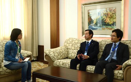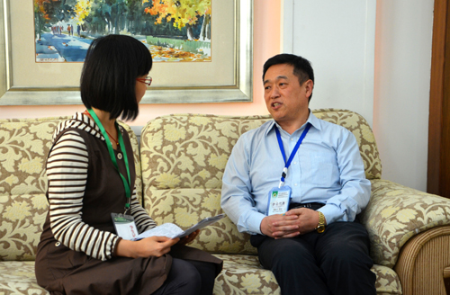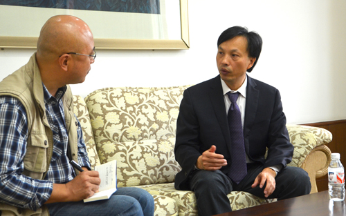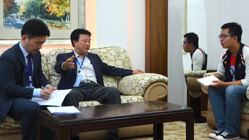 韩国农协中央会农协经济研究所金柳泰(中)接受采访