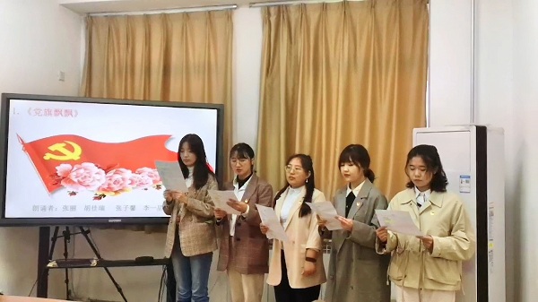 诗歌朗诵接近尾声,支部成员们被诗歌中红色激情时代的场景吸引,久久不能自拔。刘军弟老师总结时谈到:“回顾党的历史,我们党从小到大、由弱到强,在腥风血雨能够一次次绝境重生,在攻坚克难中能够不断从胜利走向胜利,根本原因就在于不管是处于顺境还是逆境,我们党始终坚持为中国人民谋幸福、为中华民族谋复兴的初心使命,义无反顾向着这个目标前进,从而赢得人民的衷心拥护和坚决支持。在我们党的领导下,党旗飘飘永远引领我们前进,每天早晨五星红旗能够高高升起,永远把我们的中国红撒向世界,描绘人类共同美好的未来!”