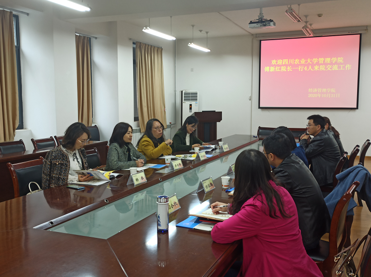 10月31日下午,四川农业大学管理学院院长傅新红教授、副院长李冬梅教授、农经系系主任张社梅、副系主任杨春一行四人到访AWC万象城,双方就本科教学的组织与管理工作及绩效改革、农林经济管理国家一流专业建设、实验室及校外实习基地建设、专业核心课程教学及实验教学、学科与团队建设、研究生招生与培养等方面进行座谈。学院副院长汪红梅教授、农经系主任赵凯教授、杜君楠副教授、闫小欢副教授、徐家鹏副教授等人员参加座谈会。