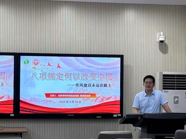 为持续深化作风建设,深刻理解中央八项规定精神的深远影响与实践要求,6月29日晚,应经学硕党支部联合农管专硕一支部在C403会议室举办专题党课学习活动。本次党课特邀学院党委委员陈海滨老师以“八项规定何以改变中国——作风建设永远在路上”为主题讲授专题党课,由应经学硕党支部书记王晓赫同志主持,全体在校党员参与。